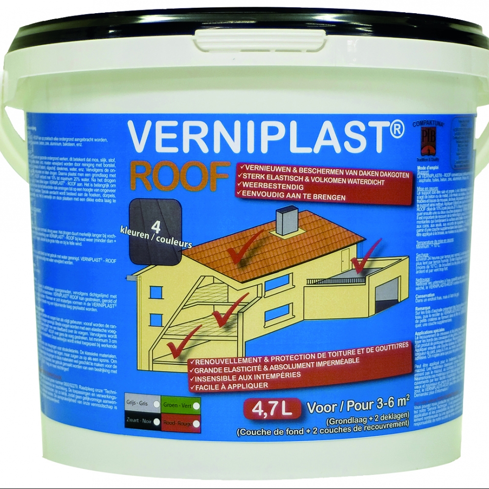 le VERNIPLAST®ROOF est un revêtement peinture Polymère modifié mono composant étanche, créant une membrane très élastique (élasticité ± 300%) excellente adhérence sur tous les supports usuels, qui permet de recouvrir sans problèmes les fissures, crevasses ainsi que les jonctions de bassin. Protection ou remise en état de toitures et de gouttières anciennes et nouvelle. Sous-couche imperméable pour terrasses, douche à l'italienne.