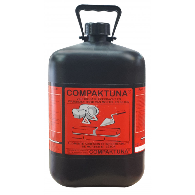 Le COMPAKTUNA® 10 litres est une résine de couleur blanche qui existe depuis 1956, c'est une résine liquide de très haute performance pour les reprises et l'accrochages des matières hydraulique, spécialement composée et utilisée comme liant plastique pour, le béton, ciment, chaux, plâtre, etc.